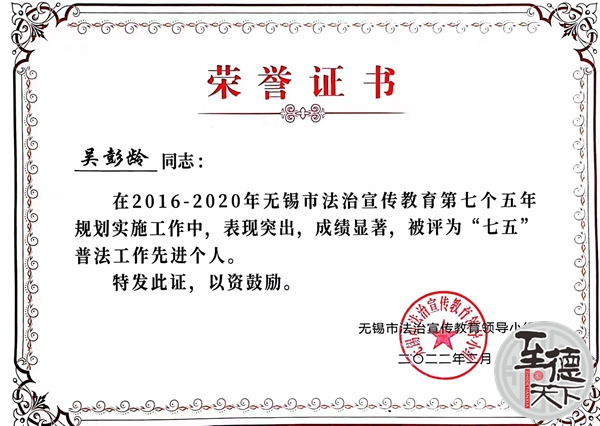 多年来,吴彭龄获得过省、市、区级政府法制、复议应诉、法制宣传、执法监督和多个政府部门先进个人和区优秀党员、先进个人等多次奖励。吴彭龄律师撰写的《从政府败诉论依法行政》等论文曾获市以上法学论文一、二、三等奖,参加的《无锡市第三届宪法宣传周法律知识竞赛》等竞赛获市以上多类法律知识竞赛一、二、三等奖,2017年获“无锡市十佳少年先锋队志愿辅导员”,2018年12月获无锡市律师协会2017年度无锡市优秀公益律师,2020年被无锡市委网信办聘为2020年无锡市网信普法专任讲师,2021年获无锡市律师行业优秀共产党员,2022年获无锡市“七五”普法先进个人,2023年被聘江苏省公共法律服务人才库成员。吴彭龄律师能胜任办理民事、行政诉讼案件和刑事案件,尤其擅长担任各级政府和相关企事业单位的法律顾问,参与协商、谈判、调解和见证,能主持各类大型活动,尤其擅长法治宣传、讲解或培训。