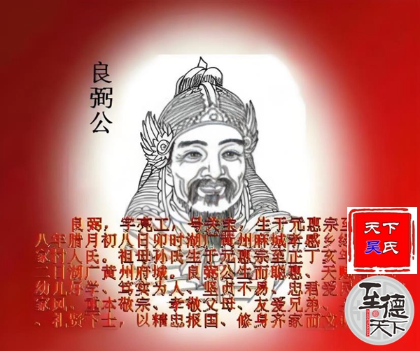 良弼祖字亮工号关宝,生于元惠宗至正戊子八年腊月初八日卯时湖广黄州麻城孝感乡绿豆社吴吴家村人氏。祖母孙氏生于元惠宗至正丁亥年腊月十二日湖广黄州府城。良弼公生而聪惠、天赋善良、幼儿好学、笃实为人、坚贞不易、忠君爱民、恪守家风、重本敬宗、孝敬父母、友爱兄弟、身先士卒、礼贤下士,以精忠报国、修身齐家而文明于世。弼祖于明之初集众护乡胆略过人,为孝感乡参将,其后为维护和巩固明朝政权而南征北战。龄至二十有七之时方与孙公孝廉之女玉蓉成婚。