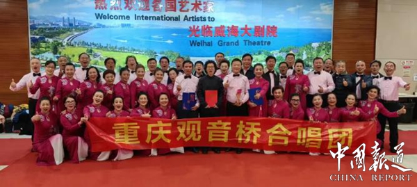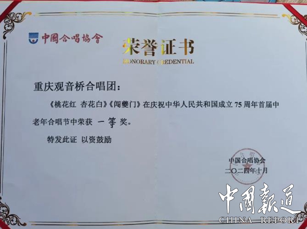 中国报道讯(吴蜀丰报道)日前,由中国合唱协会主办的“庆祝中华人民共和国成立75周年首届中老年合唱音乐节”在山东威海大剧院圆满落幕。重庆市江北区观音桥合唱团经过与来自全国的近五十支中老年合唱团的激烈角逐,经专家的严格评审,斩获三项大奖:演唱一等奖、优秀指挥奖、优秀钢琴伴奏奖,成为本届中老年合唱节上唯一一支获得“大满贯”的队伍!