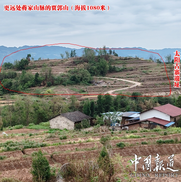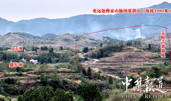 站在海拔近700米的太阳古寨上,东可望近在咫尺的梨子湾、道山沟隘口(马搭岩、梯子口)、高峰岩,以及野麦山、虾爬沟、代家岩、长江,到高家镇、横梁。南可望躲军冲,旧屋嘴,槽坊,大冲,沙坝,开花寺,铁匠湾,背后湾,坝上湾,朱家沟,金狮湾,立石冲。西看大石坝,上吴家湾,狮子冲,椒树坪,新坪场,深沟至八角庙方向。往北打望人文厚重的下吴家湾(楼脚),吴家屏,梁井湾,王家山,后头湾至更远蒋家山脉的贾郭山(海拔1080米)。
