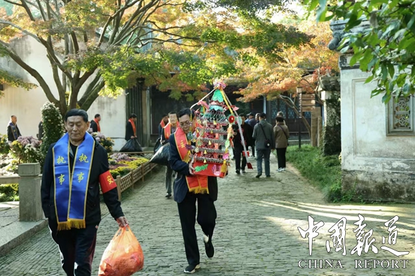 随后,祭祖仪式正式开始。司仪吴健龙高声宣布仪式流程。主祭者神情庄重,缓缓走向祭台。在司仪的引导下,主祭者带领全体人员行祭祀礼,一鞠躬、再鞠躬、三鞠躬,每一次弯腰都饱含着对先祖的崇敬与追思。接着,献帛塔环节有序进行,精美的帛缎被恭敬地献上,象征着后人对泰伯的诚挚心意。