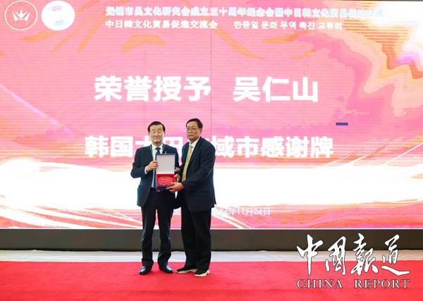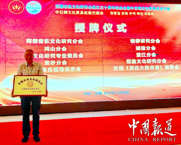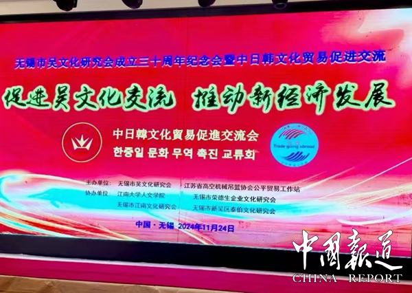 中国报道讯(通讯员吴温桦)11月24日,“无锡市吴文化研究会成立三十周年纪念会暨中日韩文化贸易促进交流会”在锡州花园酒店召开。这次大会分两个阶段举行,纪念会和学术分享由吴文化研究会主办,交流会的举办单位是江苏省高空机械吊篮协会公平贸易工作站。来自海内外的吴文化研究学者和企业经贸界代表约258人出席这次大会。