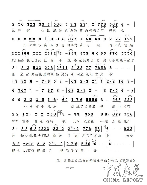 “大茶壶作证,你背着红茶篓”似是昨日般的清晰。“茶香着晚风,飘啊飘啊飘到了,我的心上”是茶山生活的质朴和温馨。“石灰铺街里,还传来茶山斗歌吗”是茶山不灭的热情和活力,“巨元笋茶香骨,是舌尖上的故事啊”是茶山茶文化的深厚底蕴。“绿油油的茶山园,我生命里勤丰的茶铺”是茶山园的生机勃勃,“我的茶妹妹在那里,给我的爱,叫我永生不忘啊”是创作者对茶山和那个姑娘的深厚感情。沧海桑田,对茶山的心中的爱永不会变。