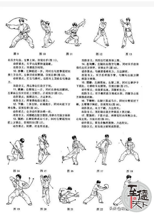 解析拳谱,十六个动作为:1、无极式;2、两仪式;3、开弓式;4、冲天炮;5、闭地肘;6、合手揣裆;7、托枪式;8、炮提式;9、担山式;10、跪膝;11、捋手;12、独立式;13、绕步穿袖;14通背式;15、挂塔式;16、归原式。