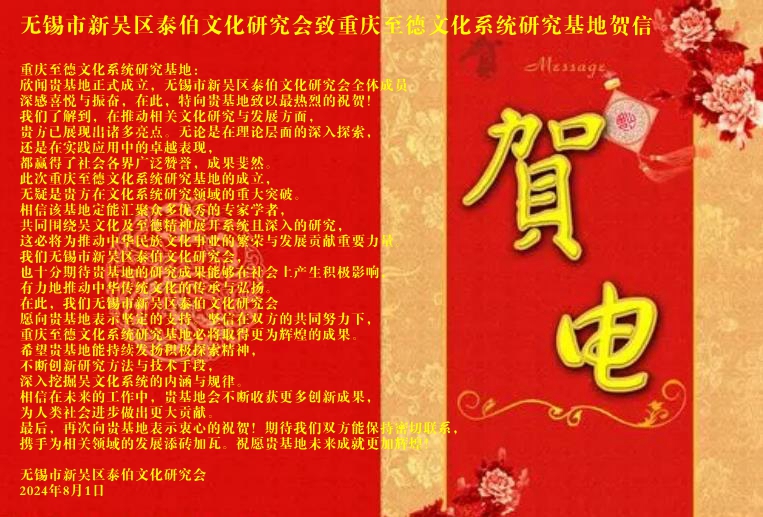 在此,我们无锡市新吴区泰伯文化研究会愿向贵基地表示坚定的支持。坚信在双方的共同努力下,重庆至德文化系统研究基地必将取得更为辉煌的成果。