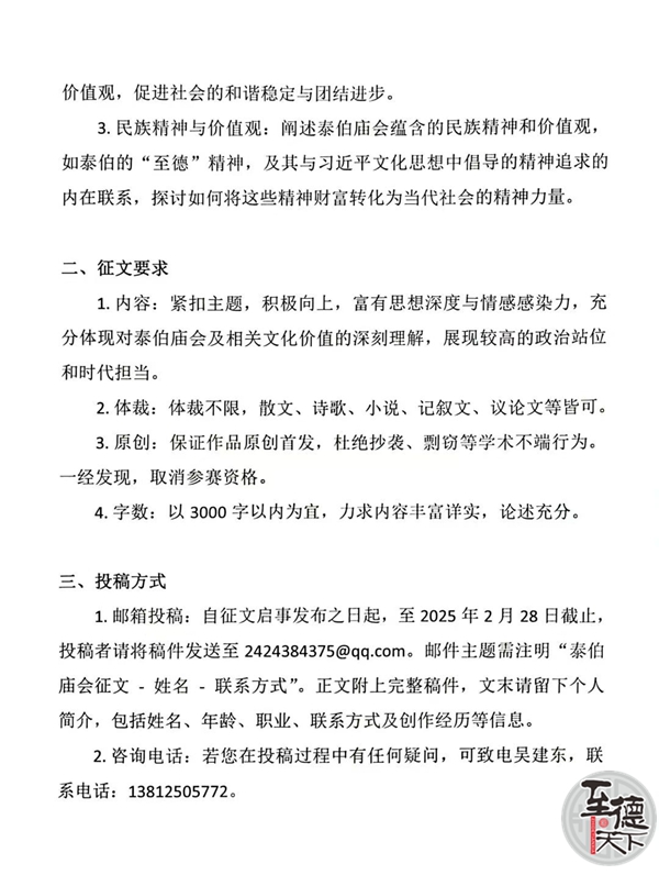1.邮箱投稿:自征文启事发布之日起,至2025年2月28日截止,投稿者请将稿件发送至2424384375@qq.com。邮件主题需注明“泰伯庙会征文-姓名-联系方式”。正文附上完整稿件,文末请留下个人简介,包括姓名、年龄、职业、联系方式及创作经历等信息。