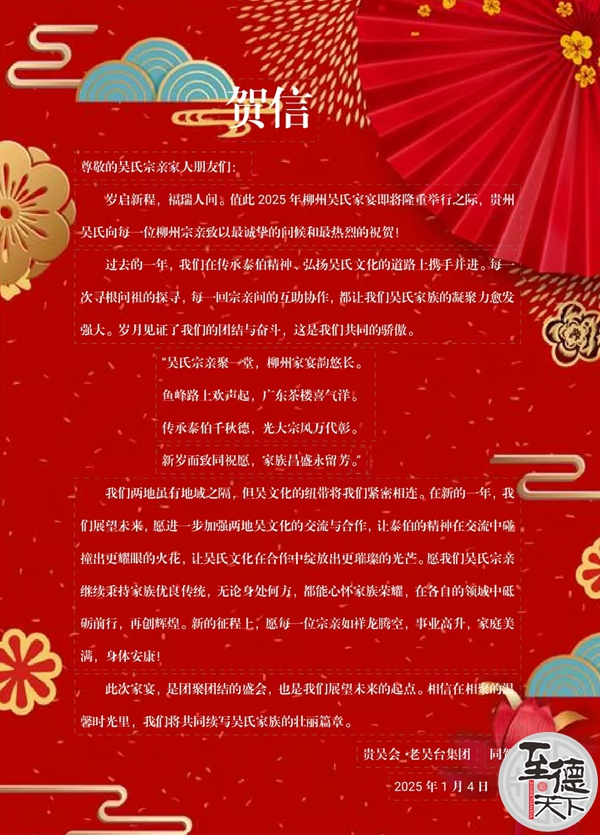 岁启新程,福瑞人间。值此2025年柳州吴氏家宴即将隆重举行之际,贵州吴氏向每一位柳州宗亲致以最诚挚的问候和最热烈的祝贺!