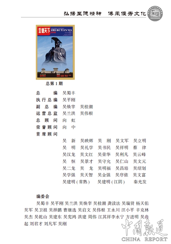 中华至德十二姓,华夏至德名圣,浙吴总会执行会长吴焕宰的诗词五首,《至德天下》创刊号得到了晋商万里茶(武夷山)茶叶有限公司,福建南平祥寿茶籽科技有限公司,贵州老吴台集团,温州凯诚包装有限公司等单位友情赞助。