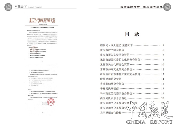 据介绍了,重庆至德文化系统研究基地成立暨《至德天下》创刊号,共收到来自英国、马来西亚、香港及吴氏祖地和全国省、市贺电159封,创刊号内容较为丰富,收录有《创刊词●成人达已至德天下》,精选11封贺电。