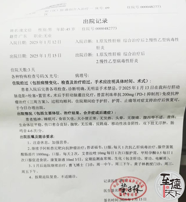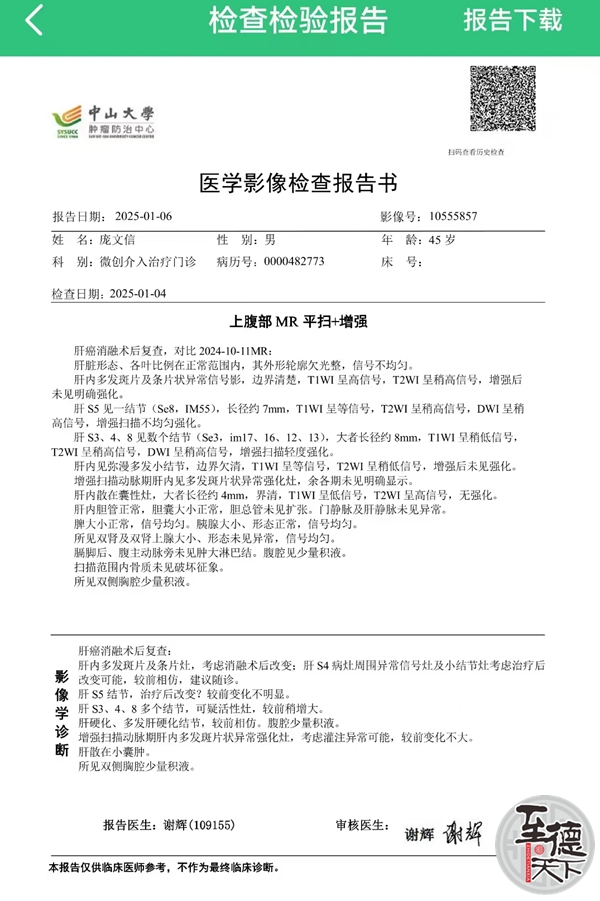 一位肝癌患者,服用吴家育医师开的中药半个月后,去医院做检查的结果,与前次的检查报告单对比,效果明显。这是医院检查的报告单内容:中山大学 STSUCC 肿瘤防治中心  ,医学影像检查报告书 ,报告日期:2025-01-06 ,影像号:10555857,姓 名:庞文信 ,性 别:男 ,年龄:45岁 科 别:微创介入治疗,门诊 病历号:0000482773 。