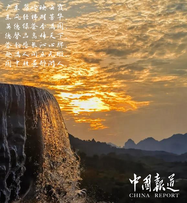 广东翠岭映云霞,东风轻拂醒芳华。英德绿茶香满园,德馨品高传天下。茶韵悠长沁心脾,趣满人间乐无暇,园中胜景醉游人。