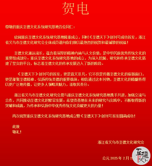 浙江省义乌市至德文化研究会致重庆至德文化系统研究基地贺电