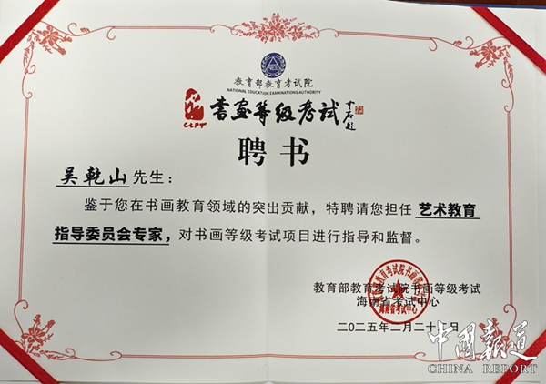 日前,新华社特约摄影师,中国摄协会员,海口市摄协副主席吴乾山于2月12日收到来自国家教育部海南考试中心聘书,即吴乾山:鉴于您在书画教育领域的突出贡献,特聘请您担任艺术教育指导委员会专家,对书画等级考试项目进行指导和监督。(图文/吴蜀丰)