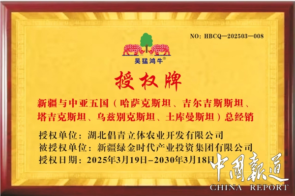 据授权书介绍,兹有湖北倡青立体农业开发有限公司授权新疆绿金时代产业投资集团有限公司 为新疆与中亚五国(哈萨克斯坦、吉尔吉斯斯坦、塔吉克斯坦、乌兹别克斯坦、土库曼斯坦)区域内的商标品牌:“吴猛”头像、“吴猛鸿牛”,品名:吴猛红牛维生素能量饮料与吴猛鸿牛铁皮石斛能量饮料、吴猛鸿牛肉苁蓉黄精能量饮料(铁罐装)唯一经销商,授权时间从2025 年 3 月 19日至2030年3月18日止。授权书与签订代理合同、订货单、转帐记录同时存在才生效。