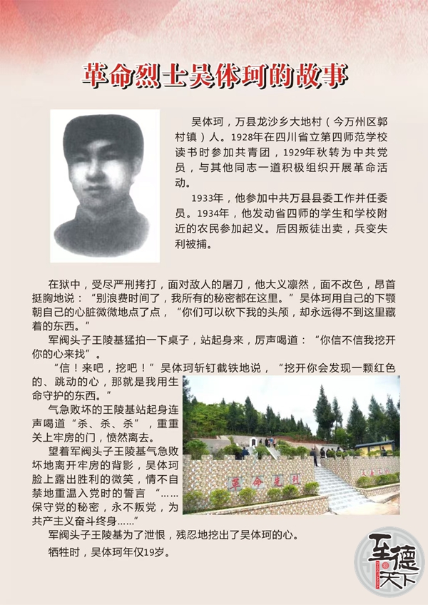 吴体珂烈士,1930年4月,转为中国共产党党员,任中共地下党第四师范学校支部书记,1928年,在万县省立第四师范学校读书期间,积极参加学生运动,并加入中国共产主义青年团。