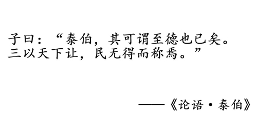 子曰:“泰伯,其可谓至德也已矣。三以天下让,民无得而称焉。”孔子说:“泰伯,可以说是德行至高无上了。多次辞让天下,老百姓简直找不到恰当的词语来称赞他。”