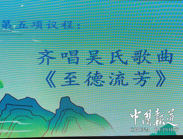 全体起立齐唱《国歌》,齐祭拜泰伯公仲雍公季历公,“一鞠躬、再鞠躬、三鞠躬”礼成,创新抽奖方式特邀贵吴会老吴台董事长吴学强、江津吴弟伟,壁山区吴波,大渡口吴文平,南岸区吴晓桐上台抽奖,中奖者获赠《至德天下》创刊号及重庆至德文化系统研究基地徽章。吴子强在会上分享倡议书有关事宜,播放由吴全生作词、谱曲的《吴氏永耀天下》,吴蜀丰作词、吴全生谱曲的《鸿牛之光》,最后播放贵吴会老吴台企业专题片。