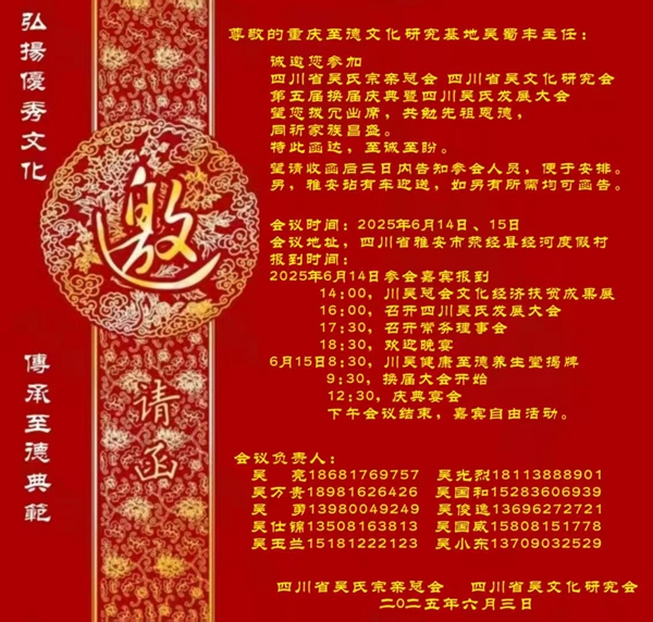 谨祝贵会会务昌隆,愿川渝吴氏携手共进,赓续"三让天下"的至德家训,为中华优秀传统文化复兴再立新功!