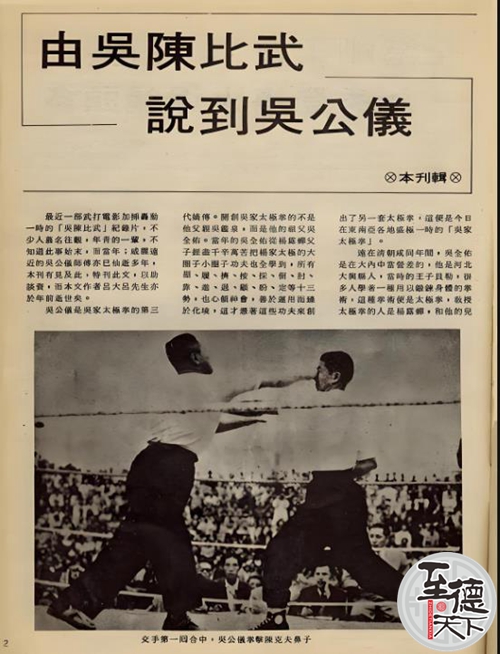 1937年,吴公仪在香港成立鉴泉太极拳分社,担任社长。1942年香港沦陷前回上海,担任鉴泉太极拳社社长。1948年,应港澳人士之聘请,重返香港复社。1954年,由于他在香港教授太极拳认真,学员聚多、享有盛名,引人瞩目。香港拳击冠军并精通白鹤拳的陈克夫先生,登报声明,请求和公仪比武,并云如公仪不允比赛,则请回上海。经过港澳名流调解,1954年1月在澳门花园游泳池比武,借以募款救济香港火灾的难民。“吴陈比武”轰动港澳,观众万余人。陈克夫攻势猛烈,吴公仪借力回击,甫交手即击中陈克夫鼻子。陈因流血过多,休息超时。他们二次再比,双方多用脚踢,因踢超过规定过膝的公约,公证人宣布停止比赛。自此,吴公仪及吴氏太极拳名噪一时,海外团体纷纷致函邀请。吴公仪命其长子吴大揆在香港弥敦道开设九龙鉴泉太极拳分社。次子吴大齐、侄吴大新亦分赴新加坡、吉隆坡、马尼拉等地设立分社,後又因社务发展,再购买九龙佐敦道保文大厦顶楼为总社新址,原於香港骆克道的总社改称香港分社,由女儿吴雁霞及女婿郭少炯主持。从此,吴氏太极拳风行於东南亚并发扬於海外。这次吴陈比武,亦引发了金庸和梁羽生後来写出了一系列名动江湖的武侠小说。