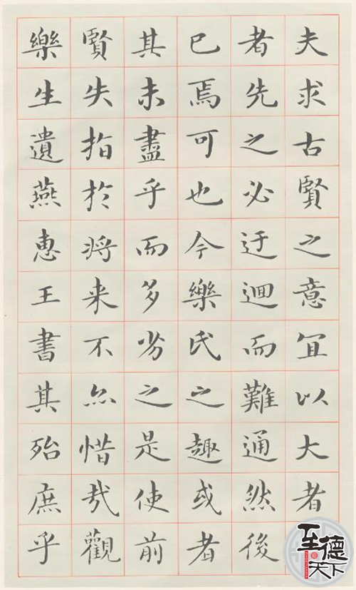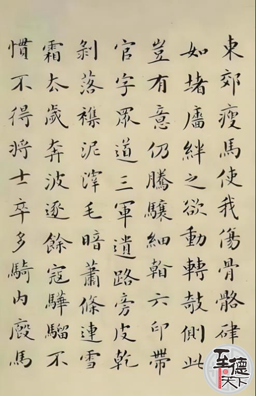 吴玉如10岁时,父亲离职,随即全家迁到天津,吴玉如入天津新学书院读书。每天去学校读书之前,总是叮嘱家人为他研好墨汁,生怕放学以后再研磨耽误了练习时间。在祖父和母亲的指导下,吴玉如练习书法一丝不苟、中规中矩,寒来暑往,持之以恒,自然有了长足的进步。每逢寒暑假,更是废寝忘食,一心扑在写字上。他当时找了一块大方砖,炊帚一柄,每天蘸水在砖上写径尺大字一小时,坚持练习三四年,所以后来写擘窠大字,一点儿也不犯愁。到十二三岁时,吴玉如写小楷、行书已具有相当功力。13岁那年,吴玉如母亲的生日来临,吴玉如用洒金折扇,一气呵成,写下了簪花格小楷,每字仅有半厘米大小,字迹工整,布局匀称,一篇苏轼的《石钟山记》跃然纸上。