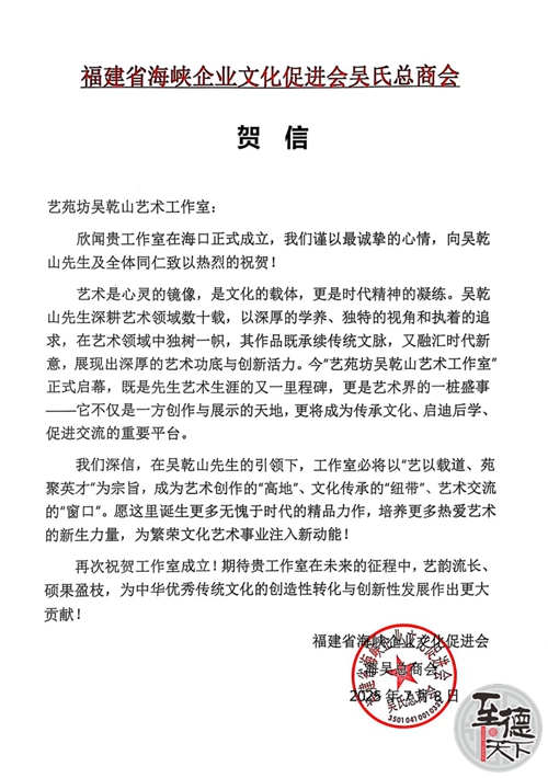 福建海吴总商会致艺苑坊吴乾山艺术工作室贺信