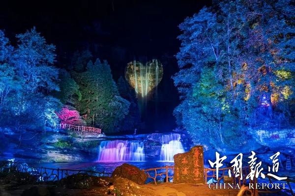 除了音乐会之外,这个暑期,每周五周六晚,还有灯光秀率先点亮望乡台,光影科技玩浪漫。1.5公里光影长廊和7大互动装置,从山脚到瀑布,沿途星河流动,灯群点亮沿路植被。夜晚灯光借助瀑布自然形成的天然心形崖壁、山体和植被地表组合演绎,展示一场集休闲娱乐性、科技观赏性、交互体验性为一体的视觉盛宴。