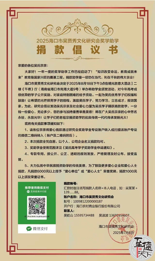 7月9日,海口市吴贤秀文化研究会特发起此次捐资助学筹款活动,诚邀了社会各界爱心人士,宗亲会员伸出援手,用善意与行动为优秀学子的成长之路添砖加瓦。