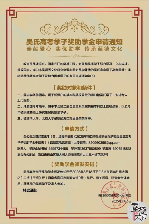 天下吴氏网讯(海南工作站吳乾山报道)教育是点亮未来的火炬,而对于许多家庭困难的孩子来说,这束光却可能因现实阻碍而黯淡。为奖励和帮助更多今年吴氏高考优秀、困境学子圆求学梦。