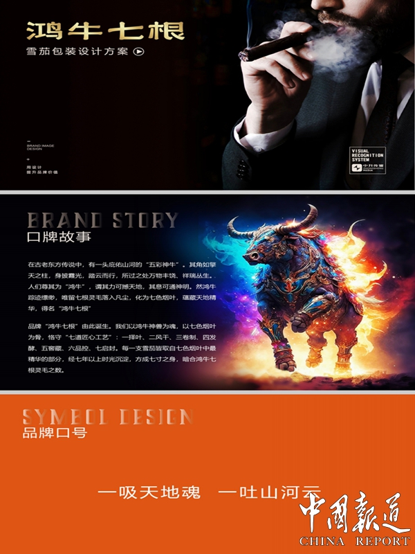一吸天地魂 一吐山河云 五彩神牛:文化与品质的双重符号图形核心的牛形象,既呼应品牌名“鸿牛”,又承载文化与品质寓意:文化维度:牛是中华农耕文明的图腾,象征“忠诚、耕耘、坚韧”,契合雪茄“慢品细赏”的文化属性,传递品牌对传统与匠心的传承;