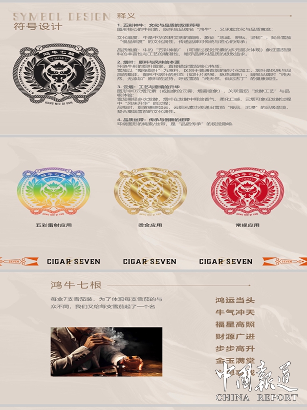 据“鸿牛七根”创始人吴利凡介绍,品牌“鸿牛七根”由此诞生。以鸿牛神兽为魂,以七色烟叶为骨,恪守“七道匠心工艺”:一择叶、二风干、三卷制、四发酵、五窖藏、六品控、七启封。每一支雪茄皆取自七色烟叶中最精华的部分,经七年以上时光沉淀,方成七寸之身,暗合鸿牛七根灵毛之数。