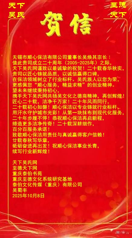 望未来继续秉持初心,携手天下吴氏网、至德天下网共扬吴文化之德商精神,再创辉煌!‌匠心二十载,洁净千万家!‌二十年风雨同行,二十载初心如磐!顺心保洁以专业铸就行业标杆,用汗水守护城市光彩!‌‌从第一块抹布到现代化服务,二十年步履不停!恭祝顺心保洁再启新程,缔造更多洁净传奇!‌‌二十载深耕细作,百分百服务承诺!致敬顺心保洁用责任与真诚赢得客户信赖!‌‌廿载春秋写华章,砥砺奋进再出发!祝顺心保洁事业长青,续写行业新辉煌!