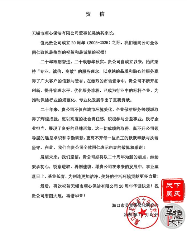 海口市吴贤秀文化研究会致无锡顺心保洁贺信