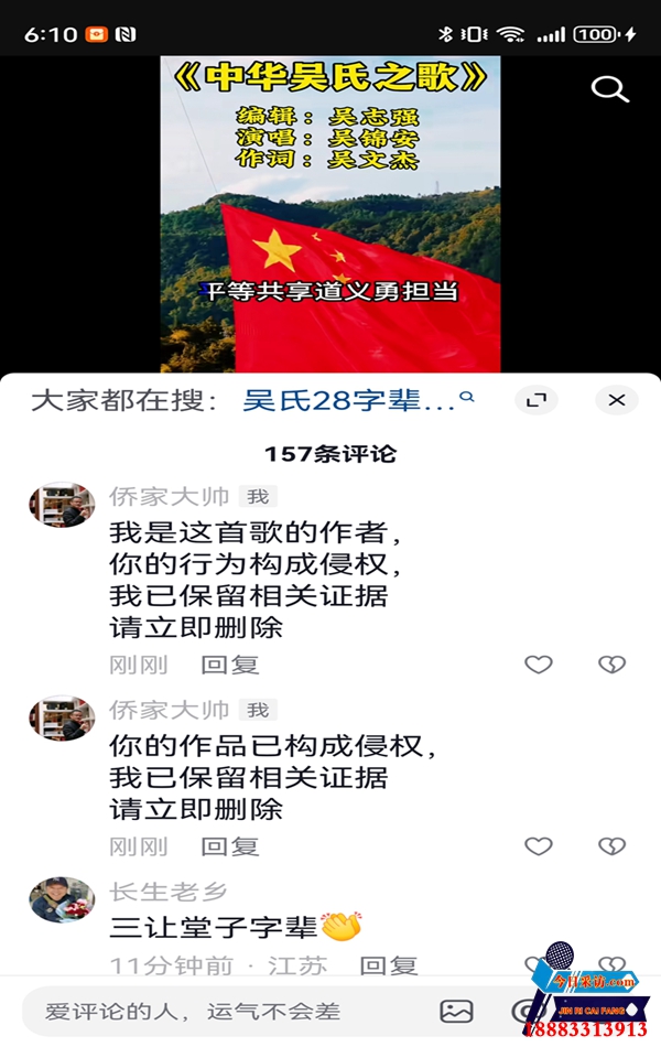 吴仕长认为,我吴氏一族,向来以至德谦让为家传之本,而今众多宗亲踊跃弘扬吴门精神、传续氏族文化,本是令人欣慰之事。然近日发觉,竟有人盗用他人作品,冒名顶替,以不正之手段违规宣传,实在令人痛心。《中华吴氏》一曲,由文富主席与谨程秘书长共撰歌词,由吾亲自谱曲并演唱,此乃确凿无疑。今有吴志强、吴文杰、吴志安三人,公然冒用此作,欺世盗名,不仅侵犯权益,更辱没我吴氏门风。在此,吾愿以文字为凭,以事实为据,敦促三位出面澄清,给天下吴姓一个坦诚的交代。文人立世,重风骨、讲性情;既不愿无端指摘,也绝不纵容蒙昧之行。望诸君自重,亦望公道自在人心。
