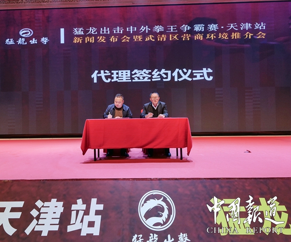 天津东升云商贸有限公司董事长王世界与吴猛鸿牛董事长正式签订天津市吴猛鸿牛总经销合同。吴猛鸿牛董事长与猛龙(天津)文化传媒有限公司董事长王世界签订猛龙出击中外拳王争霸赛天津站活动总冠名协议。(图文/吴蜀丰)