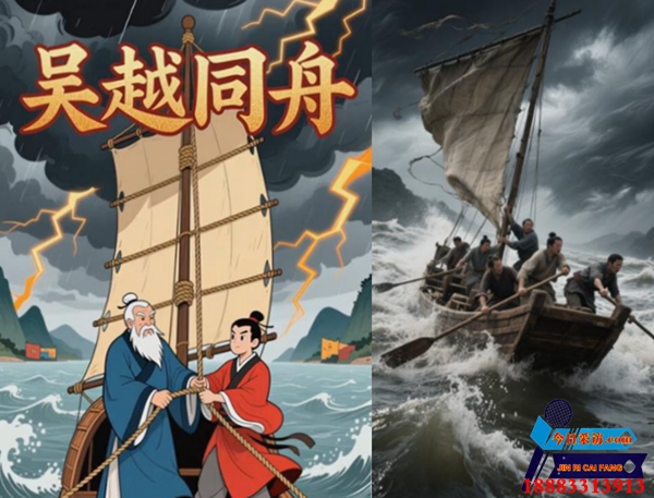 成语典故源自《孙子·九地》中“夫吴人与越人相恶也,当其同舟而济,遇风,其相救也如左右手”的记载。吴越百姓在暴风雨中解帆救船的行为,成为化解矛盾、协力求生的经典范例 [2-4]。随着历史演变,该成语被引申为利益驱动下的临时合作,如国际关系或商业竞争中的短暂协作。
