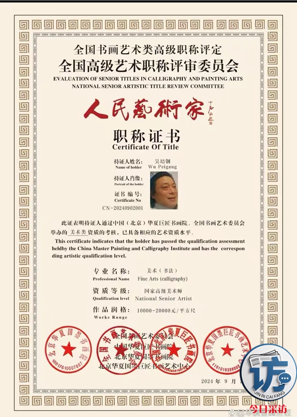 凭借数十年的艺术积累与卓越创作,吴培钢获得业界高度认可,先后荣获 “中国高级美术师”与 “人民艺术家”两大权威称号 —— 这不仅是对其专业技艺的顶尖认证,更是对他一生坚守艺术初心、深耕绘画领域的最高肯定,成为其艺术生涯中极具里程碑意义的荣耀。​2025年:荣获“澜轩杯”全国艺术大赛特等奖,这一成就进一步证明了他在艺术领域的卓越才华和不懈努力。