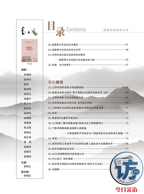 今日采访网讯(吴蜀丰 吴新强报道)为纪念季子诞辰2600周年,无锡市新吴区泰伯文化研究会常务理事副会长吴卫祖责任编辑的第十期《季子风》专辑已付梓出刊,该专辑共83页,收录38篇精品文章。内容丰富可读性强,图文并茂,历史文献厚重,收藏价值高。