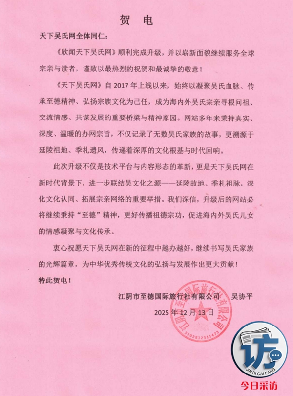 【友情提示】今日采访网坚持正确的舆论导向,坚持客观真实报道,坚持不站队,保持正确的主观立场,以弘扬至德精神!传播吴文化为主旋律!只要你姓吴,只要你是正能量的来稿,我们都欢迎!