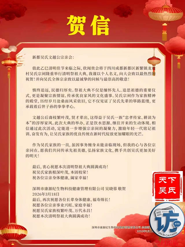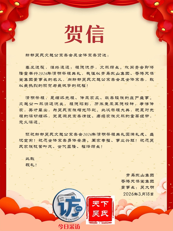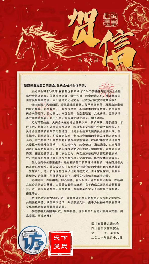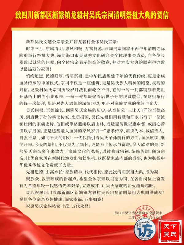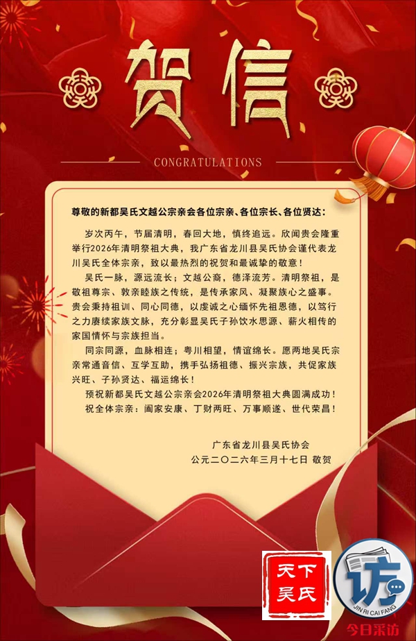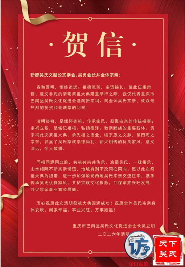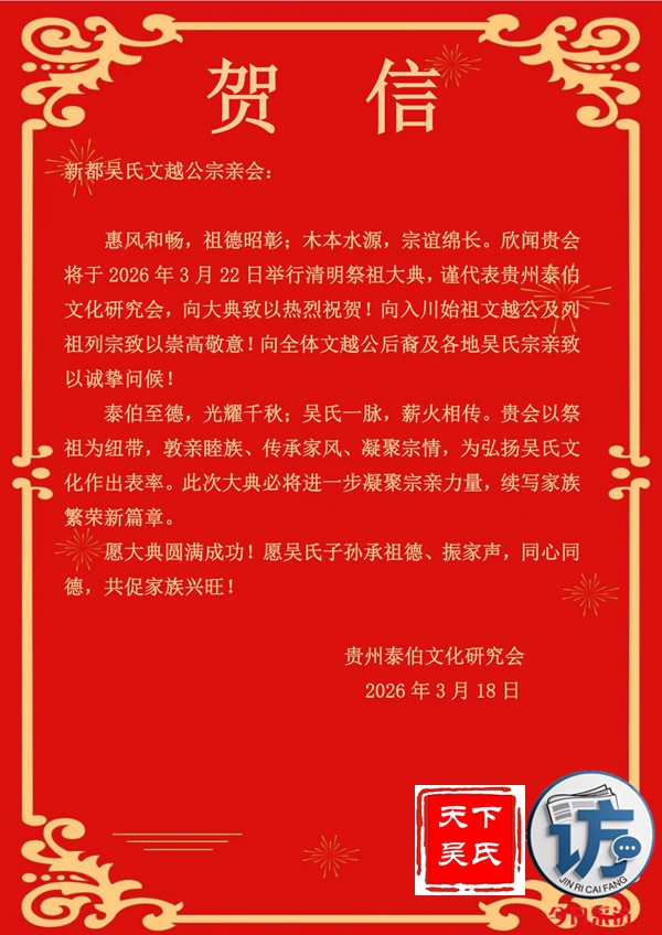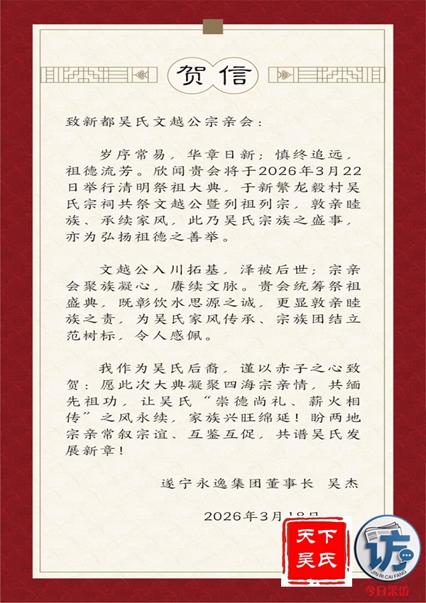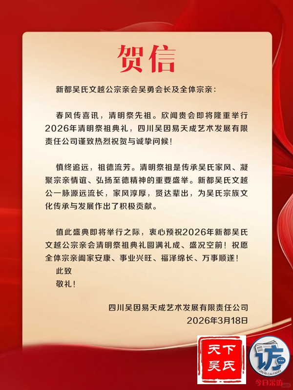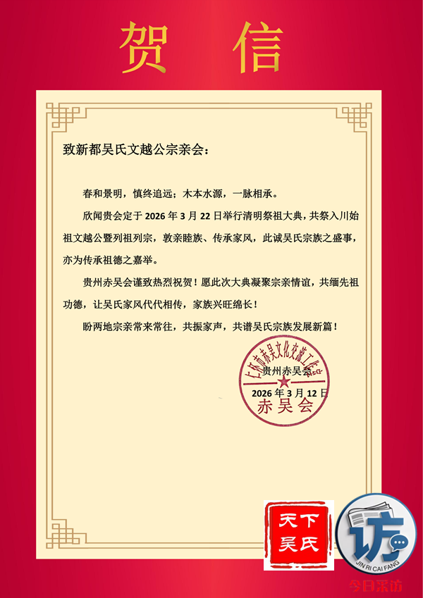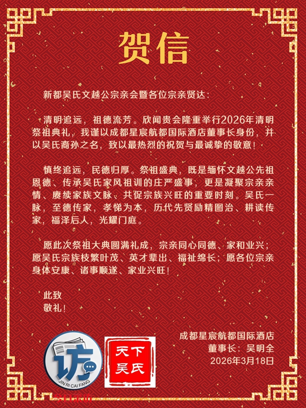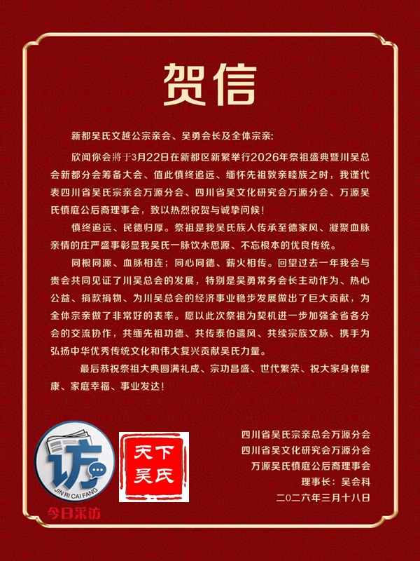 欣闻四川新都吴氏文越公宗亲会清明祭祖大典即将举行,谨致最诚挚的祝贺!慎终追远,民德归厚。此次大典,宗亲们齐聚一堂,缅怀文越公之功德,传承吴氏家族之文脉,尽显尊祖敬宗、敦亲睦族的深厚情怀。这不仅是对先祖的深切追思,更是家族凝聚力的生动彰显。愿吴氏宗亲以此次大典为契机,赓续家族优良传统,携手共进,再创家族辉煌!3月22日上午,今日采访网将向全球直播祭祖大典。