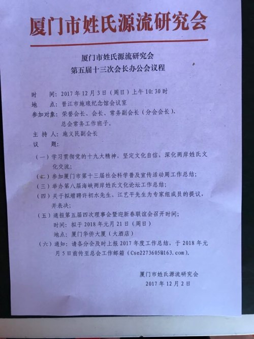 厦门姓氏源流研究会第五届十三次会长办公会
