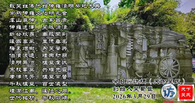 ‌      虞山葬仲,古冢苔青。仲雍遗泽,吴脉源清。断发纹身,南服开荆。让国高风,至德垂名。梅里烟树,勾吴肇兴。伯渎波远,礼乐初萌。清明荐酒,俎豆虔诚。宗枝万叶,共缅先灵。孝悌流芳,俎豆常馨。千秋俎豆,百世仪型。礼润江南,让位心同。世代铭功,‌千秋仰颂。‌