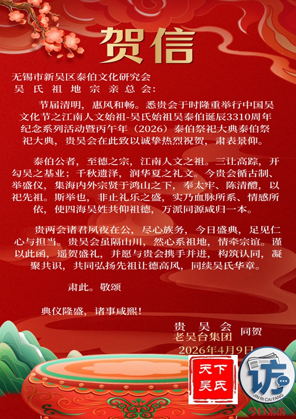 节届清明,惠风和畅。悉贵会于时隆重举行中国吴文化节之江南人文始祖-吴氏始祖吴泰伯诞辰3310周年纪念系列活动暨丙午年(2026)泰伯祭祀大典泰伯祭祀大典,贵吴会在此致以诚挚热烈祝贺,肃表景仰。