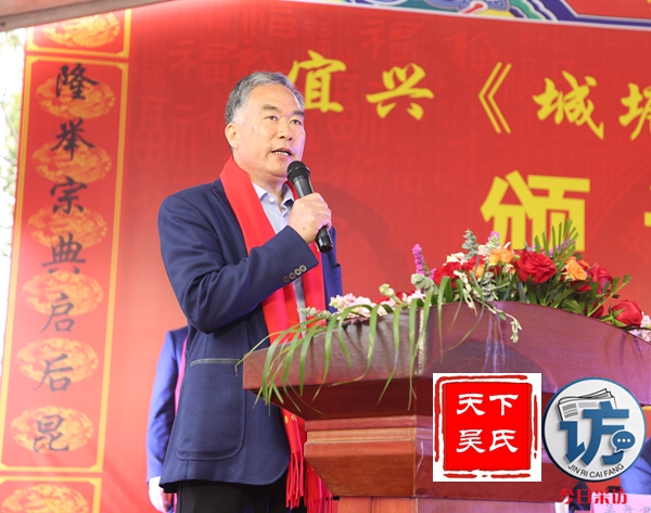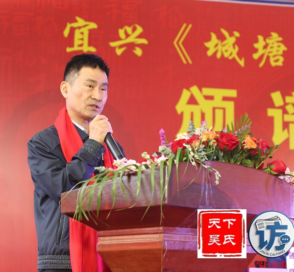 宜兴市吴氏文化研究会会长吴玉明在致词中说,时值清明,慎终追远,我们欢聚一堂,共同迎来宜兴城塘吴氏颁谱盛典。在此,我谨代表宜兴市吴氏文化研究会,对本次颁谱盛典表示热烈的祝贺!向出席典礼的各位来宾、各位嘉宾及各位吴氏宗亲,致以最诚挚的问候和美好的祝愿!