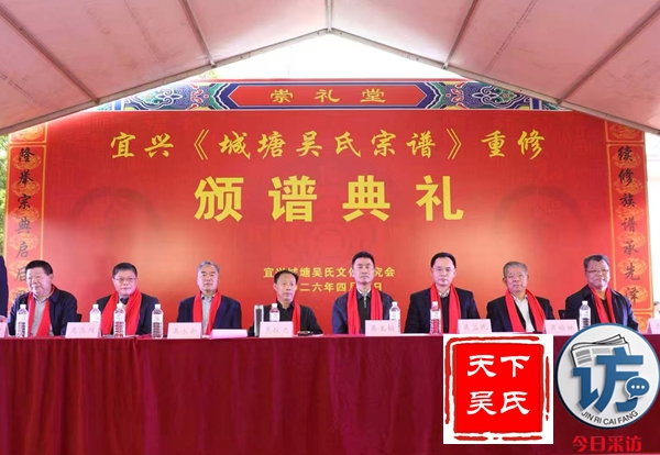 典礼在庄严的国歌声中拉开帷幕。宜兴市吴氏文化研究会会长吴玉明、副会长吴永新,本次修谱主修吴锭忠,以及五位特邀嘉宾共八人在主席台就座。现场举行了庄重的新谱揭彩仪式,随后嘉宾、主修及宗亲代表先后发言,回顾家族历史,展望未来发展。