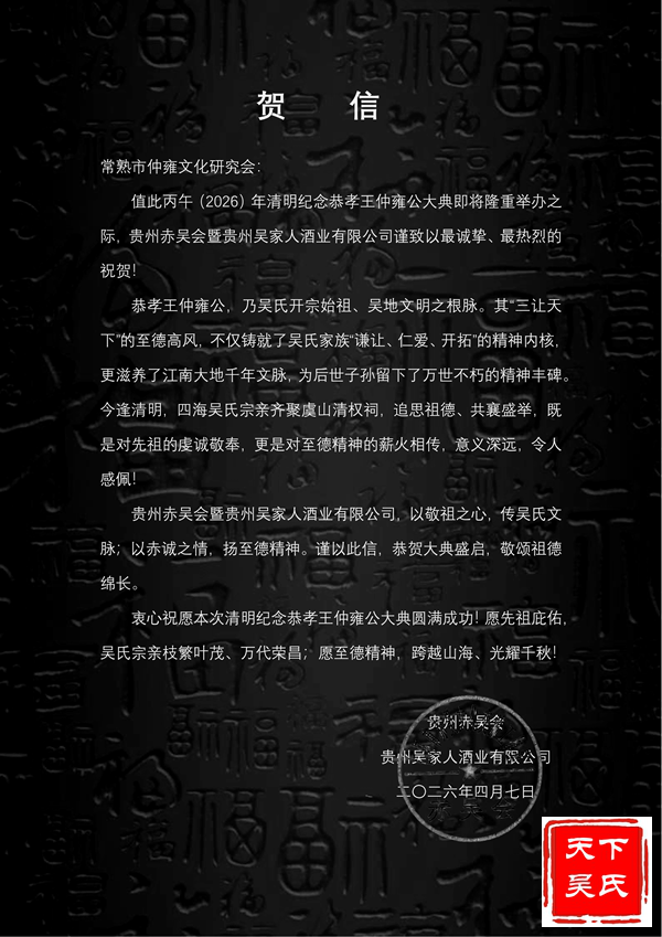 贵州赤吴会暨贵州吴家人酒业有限公司,以敬祖之心,传吴氏文脉;以赤诚之情,扬至德精神。谨以此信,恭贺大典盛启,敬颂祖德绵长。衷心祝愿本次清明纪念恭孝王仲雍公大典圆满成功!愿先祖庇佑,吴氏宗亲枝繁叶茂,万代荣昌;愿至德精神,跨越山海,光耀千秋!