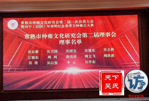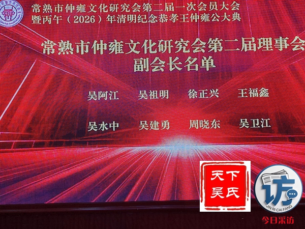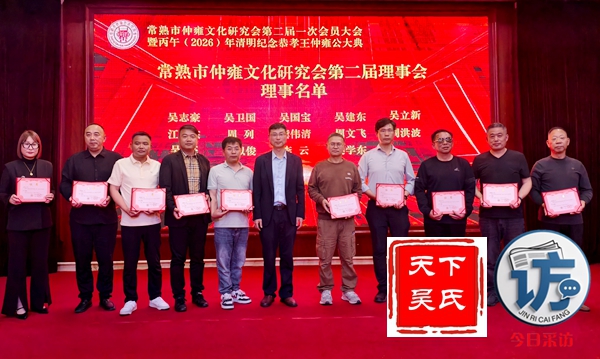 常熟市仲雍文化研究会选举产生了第二届理事会成员,第二届理事会选举由吴建明会长及副会长、秘书长、监事,他们是吴建明、吴阿江、吴水中、吴祖明、王福鑫、徐正兴、吴建勇、吴卫江、周晓东、吴坚、吴卫国、吴国宝、吴品珍、吴志豪、吴立新、吴建东、周列、龚伟清、吴亮、吴以俊、吴学东、周文飞、周洪波、江锡东、李云。其中当选会长吴建明,副会长吴阿江、吴水中、吴祖明、王福鑫、徐正兴、吴建勇、吴卫江、周晓东,秘书长吴坚,监事吴品珍。班子成员均上台亮并颁发聘书。