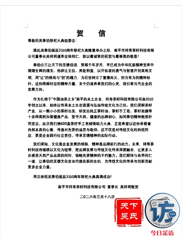 福建南平市祥寿茶籽科技公司致吴泰伯诞辰3310周年祭祀大典