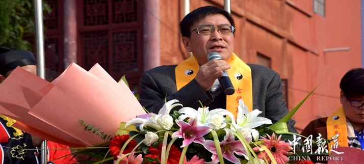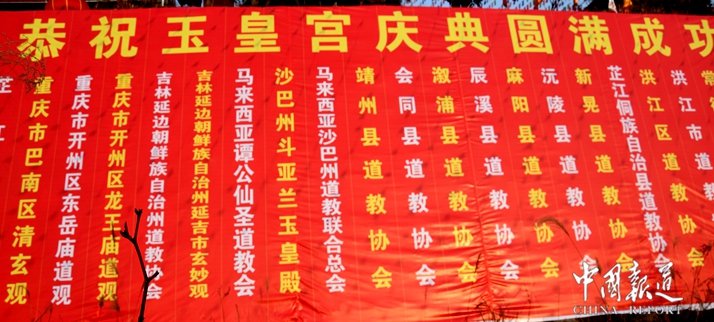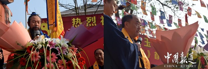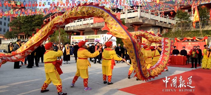冬日温暖的阳光普照玉皇宫,嘉宾云集,人山人海,锣鼓喧天,龙狮表演令活动现场热闹非凡,一片祥和气象。