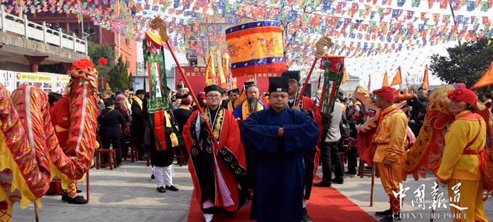 冬日温暖的阳光普照玉皇宫,嘉宾云集,人山人海,锣鼓喧天,龙狮表演令活动现场热闹非凡,一片祥和气象。