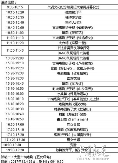 “兴文尚礼出贤能,史册永载传万代,福荫千家迎宗親,祠光焕彩耀中华”为热烈庆祝兴贤文化纪念馆吴氏大宗祠的圆满落成,和弘扬兴贤的本土文化,兴贤居委会即将举办一场大型综合文艺汇演。今日将举办一场大型综合文艺汇演和一场大型古装粤剧《五女拜寿》。古装粤剧折子戏《仙姬送子》﹑古装粤剧折子戏《钟馗嫁女》﹑大合唱《欢聚一堂》﹑BANG队现场即兴演唱﹑古装粤剧折子戏《八仙贺寿》﹑歌曲《好日子》﹑《家和万事兴》﹑《雕花的马鞍》﹑粤剧舞蹈《红豆相思》﹑南派花毽﹑舞蹈《东方红》﹑《茉莉花》﹑《我爱我的祖国》﹑时装粤剧折子戏《山乡风云》﹑水兵舞《好兄弟姐妹》﹑古装粤剧折子戏《春草闯堂》﹑粤剧舞蹈《羽衣舞》﹑时装粤剧折子戏《杜鹃山》﹑粤剧折子戏《大闹靑竹寺》等丰富多彩的文艺节目。